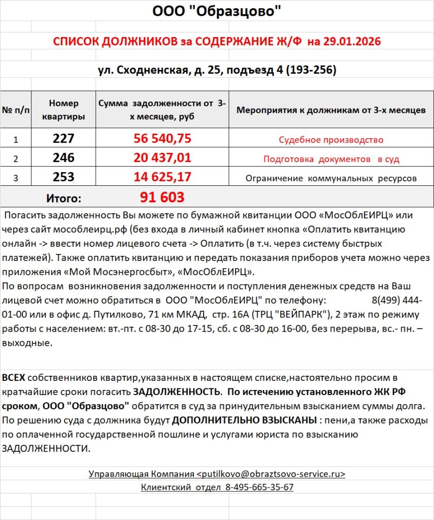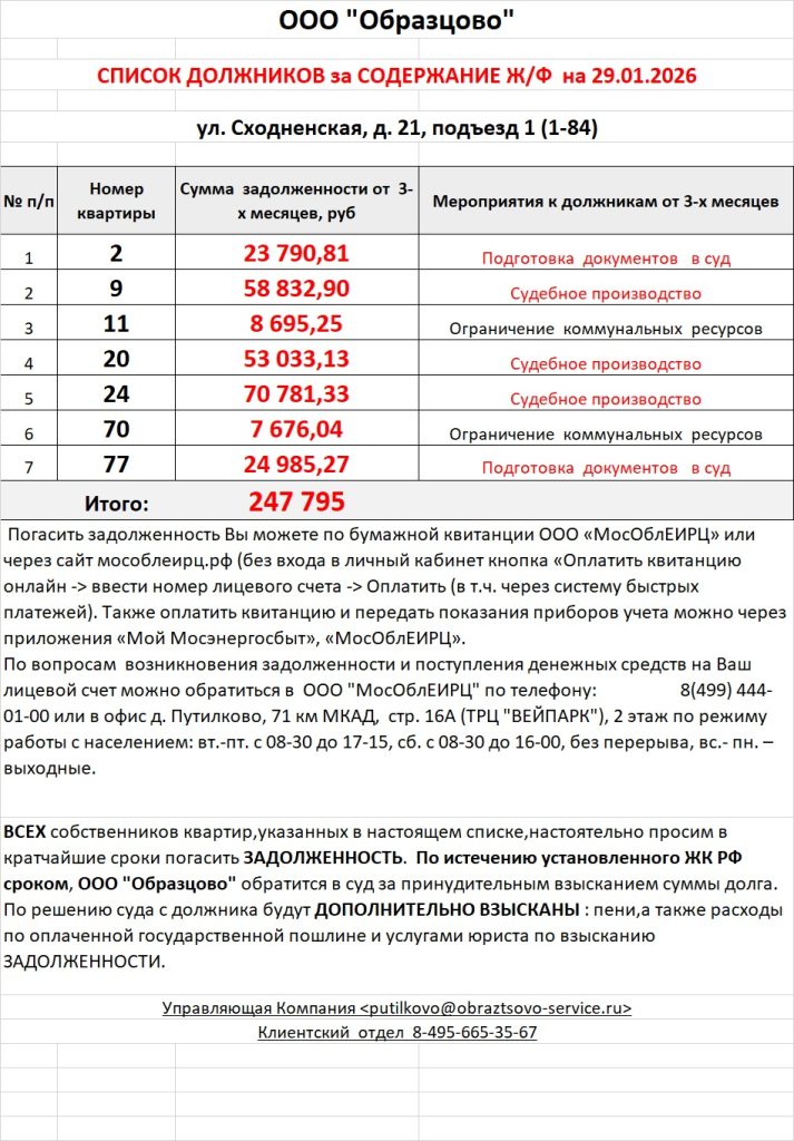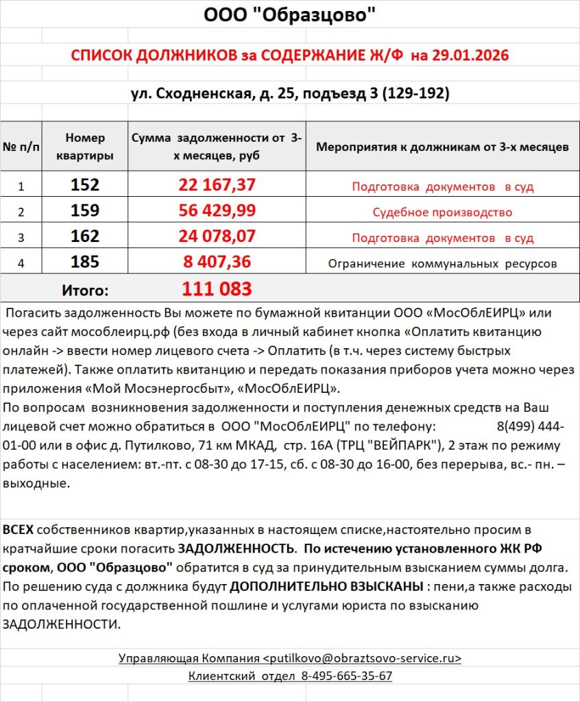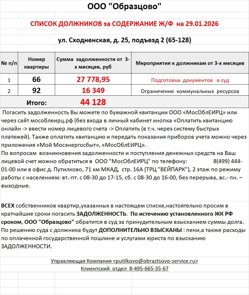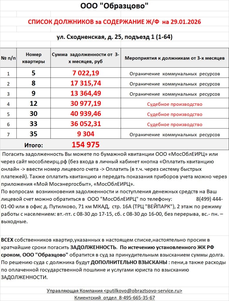 Список должников по коммунальным платежам ул. Сходненская, 25