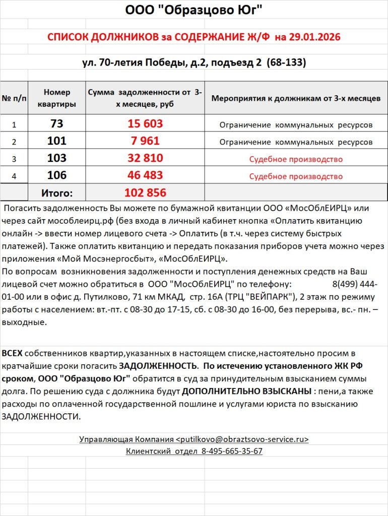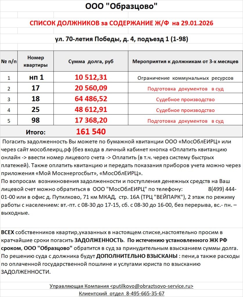 Список должников по коммунальным платежам ул. 70-летия Победы, 4