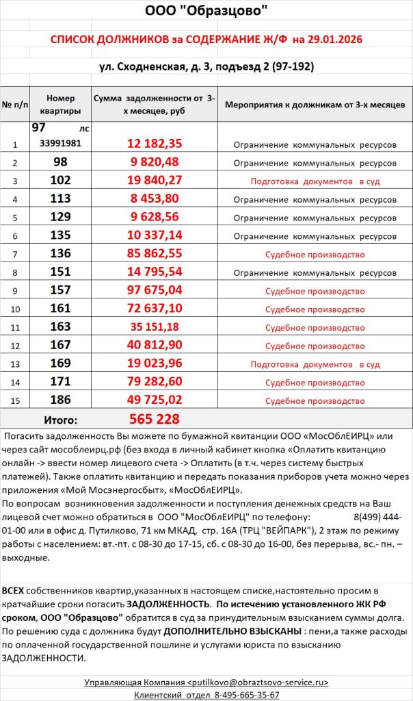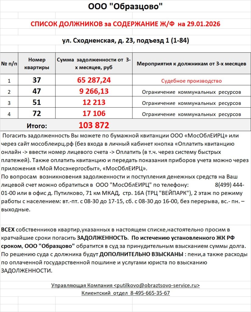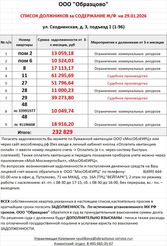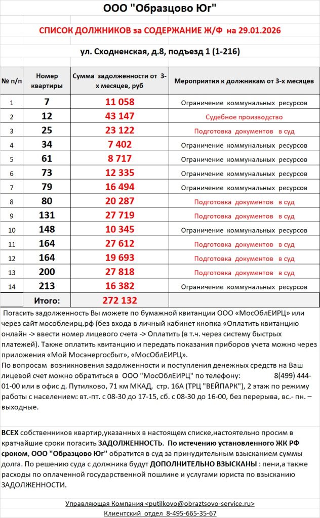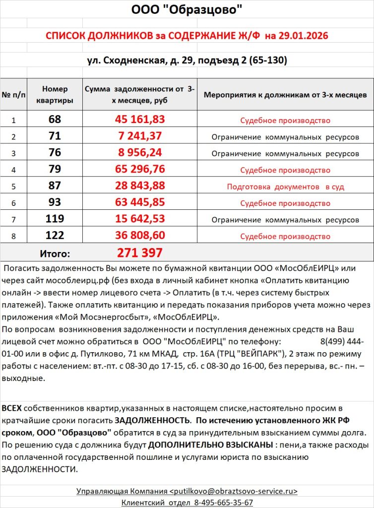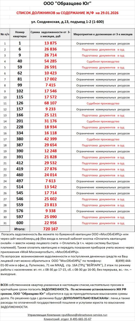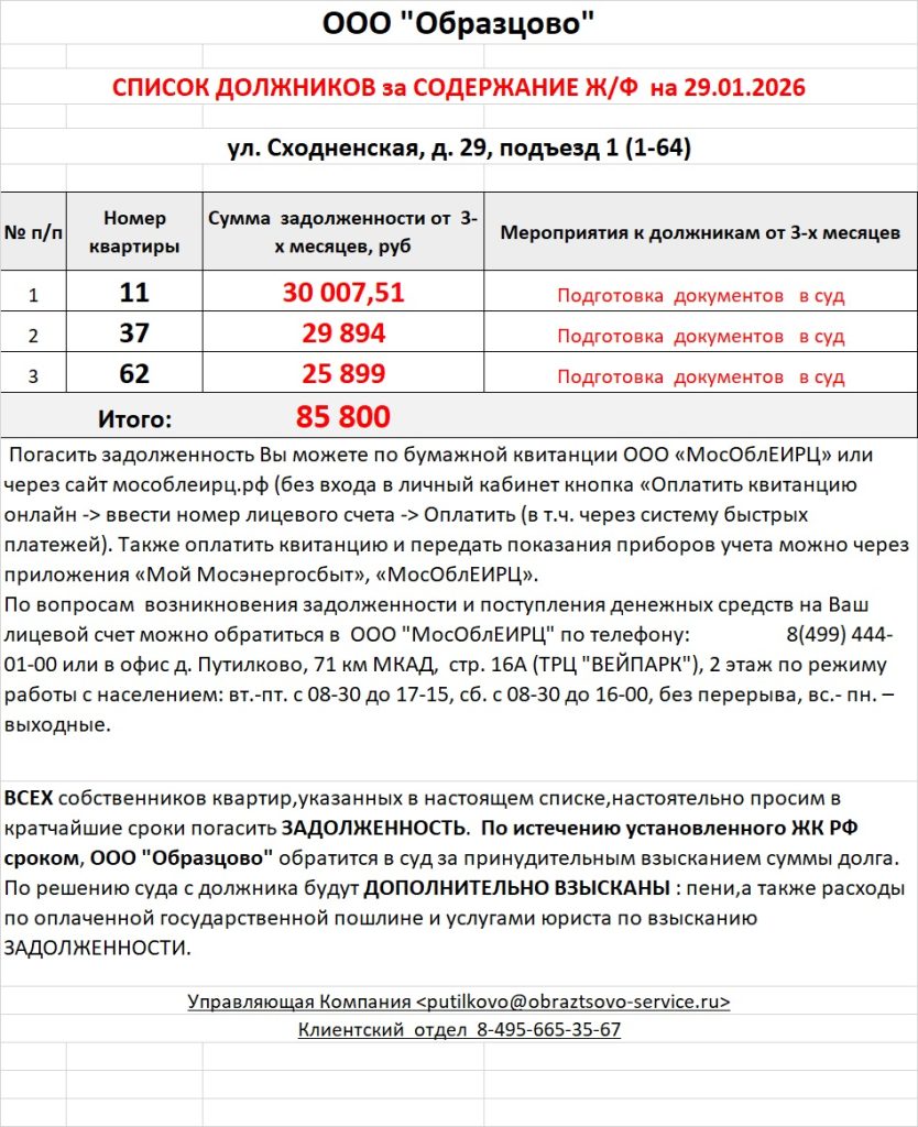 Список должников по коммунальным платежам ул. Сходненская, 29