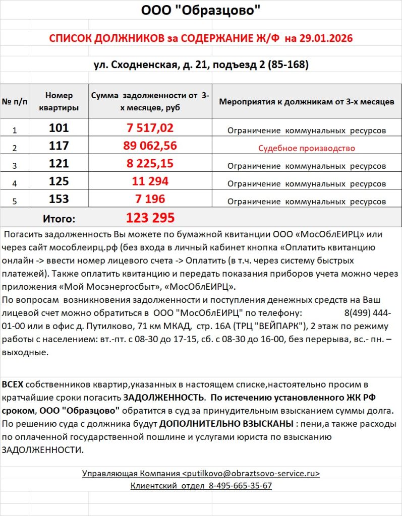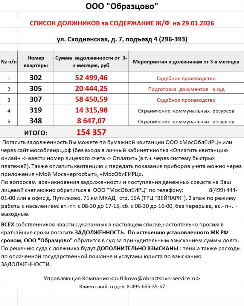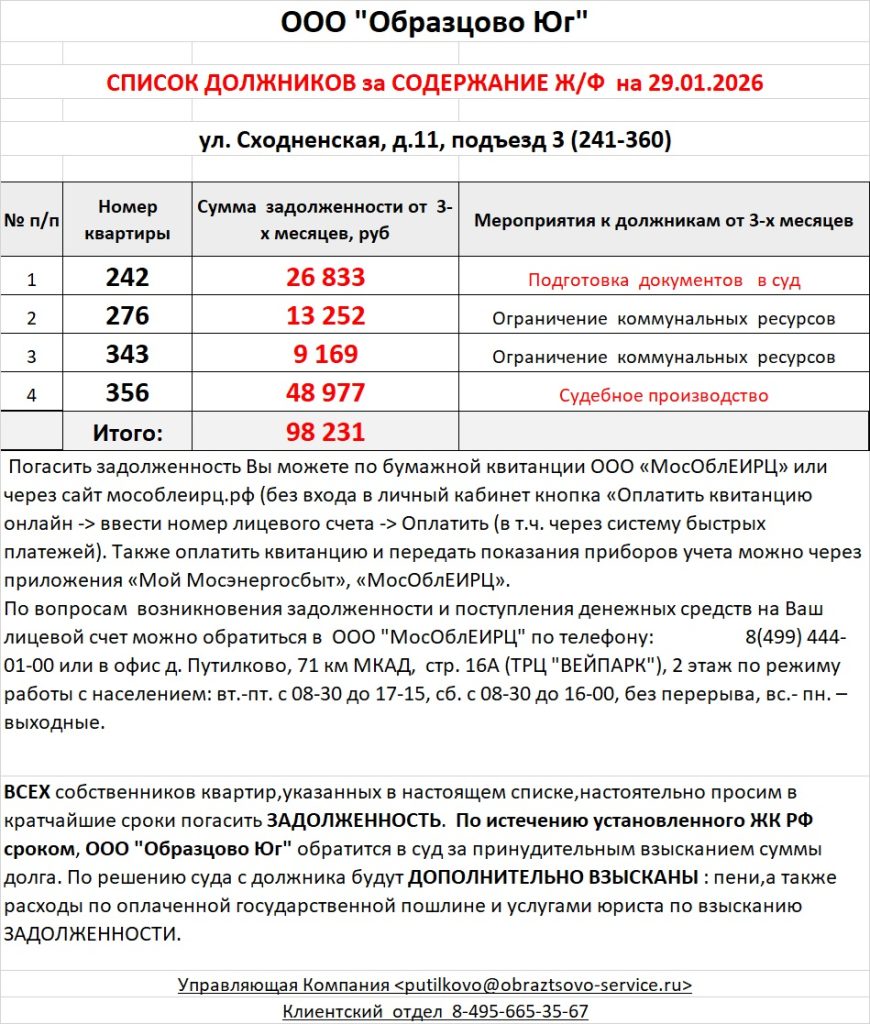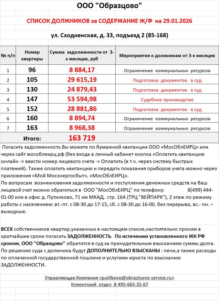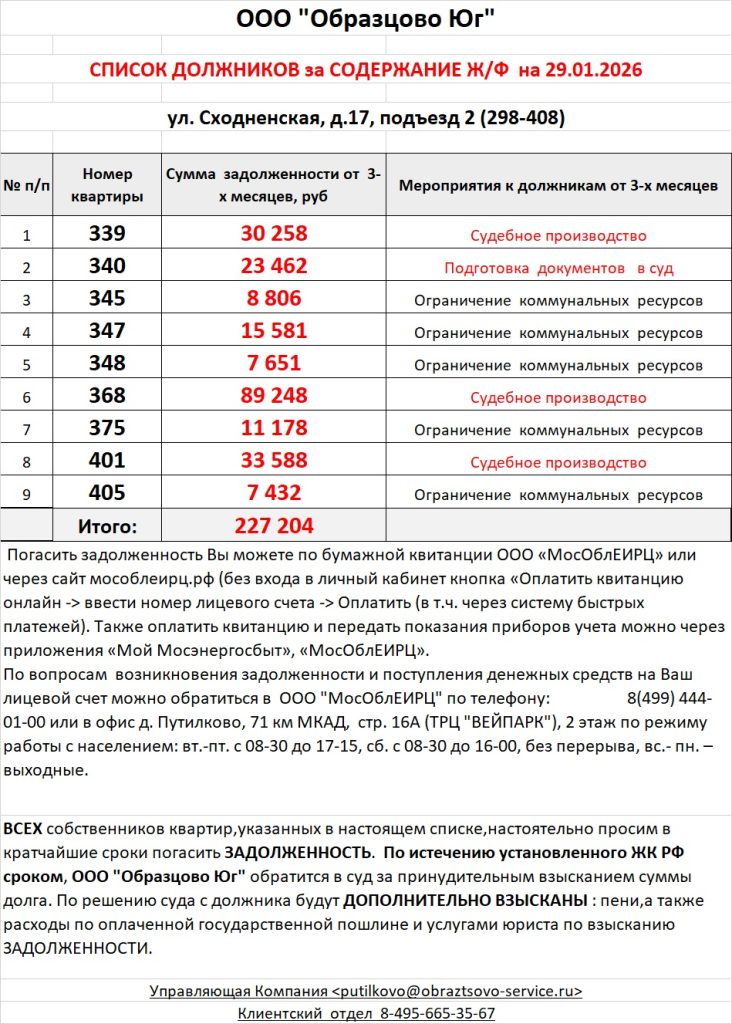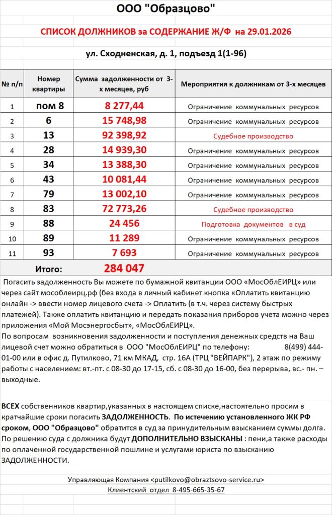 Список должников по коммунальным платежам ул. Сходненская, 29
