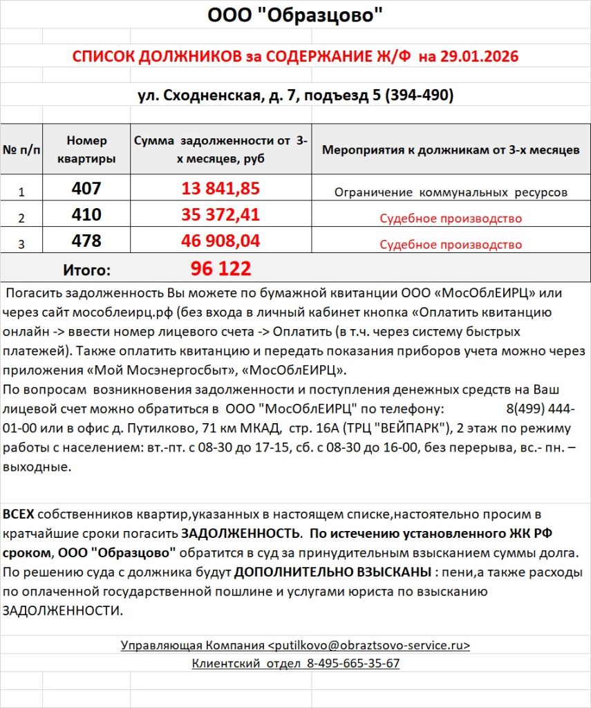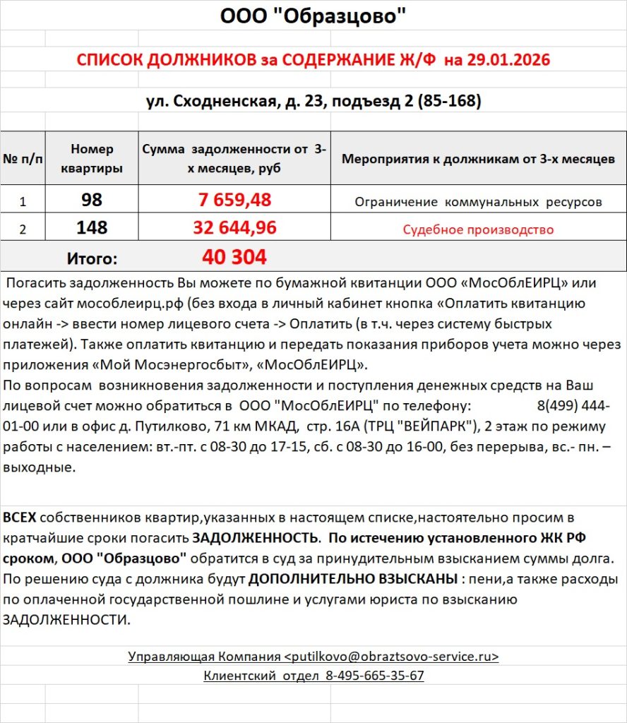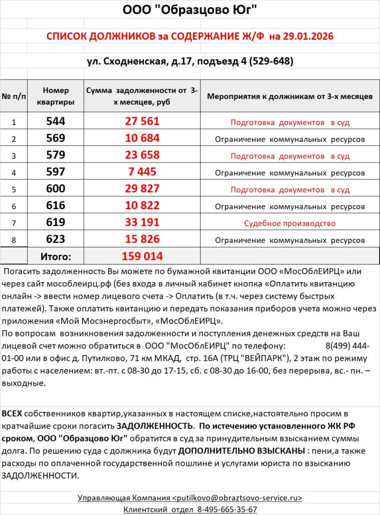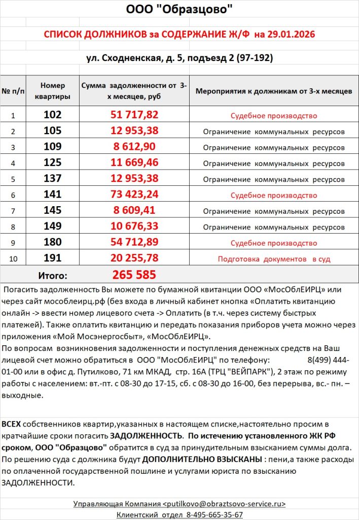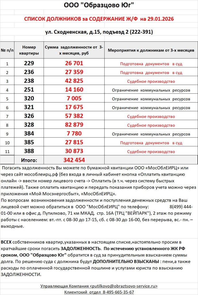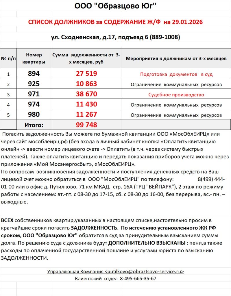 Список должников по коммунальным платежам ул. Сходненская, 29