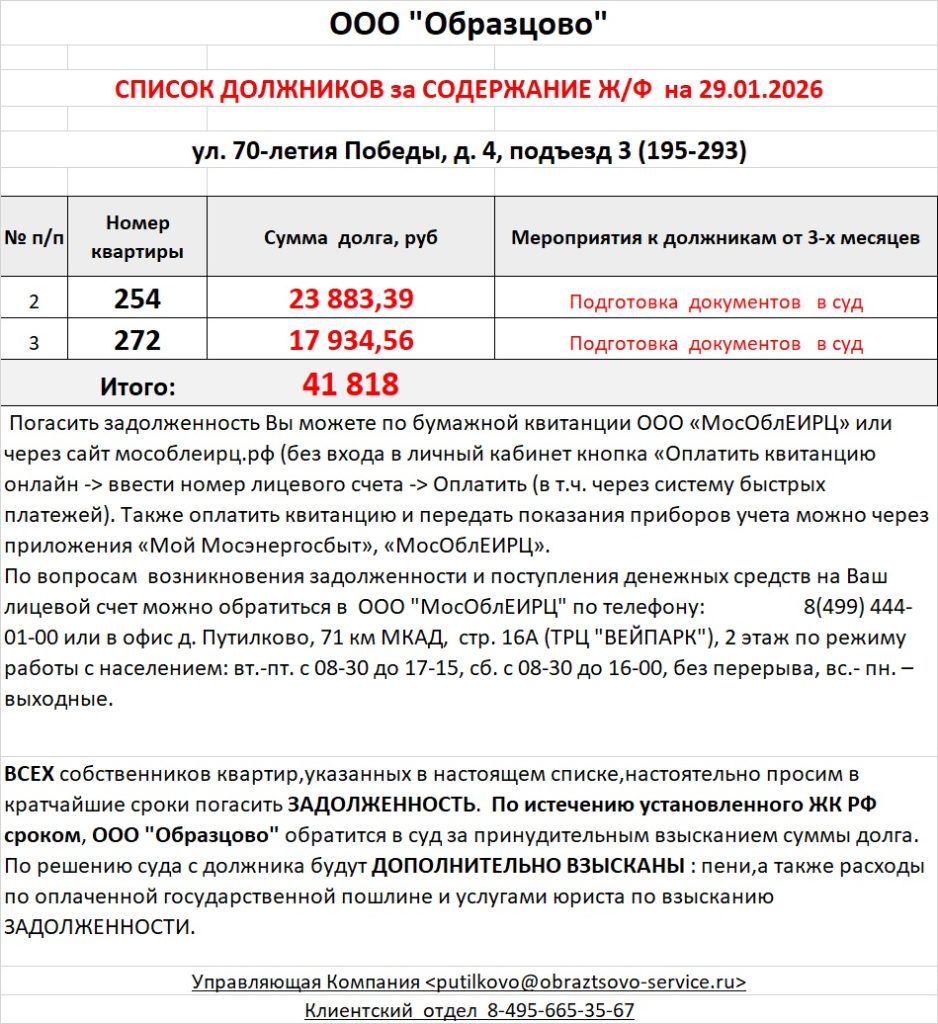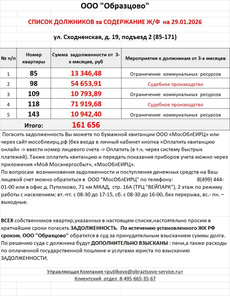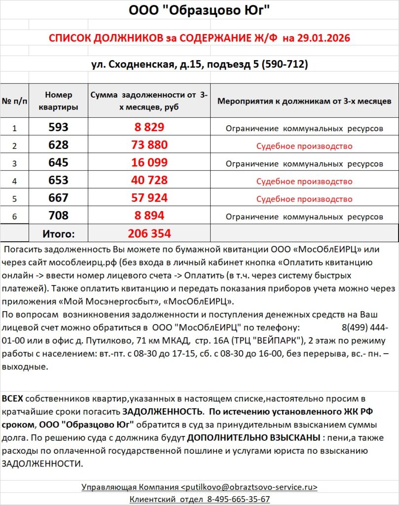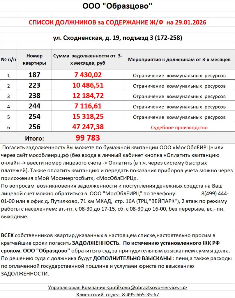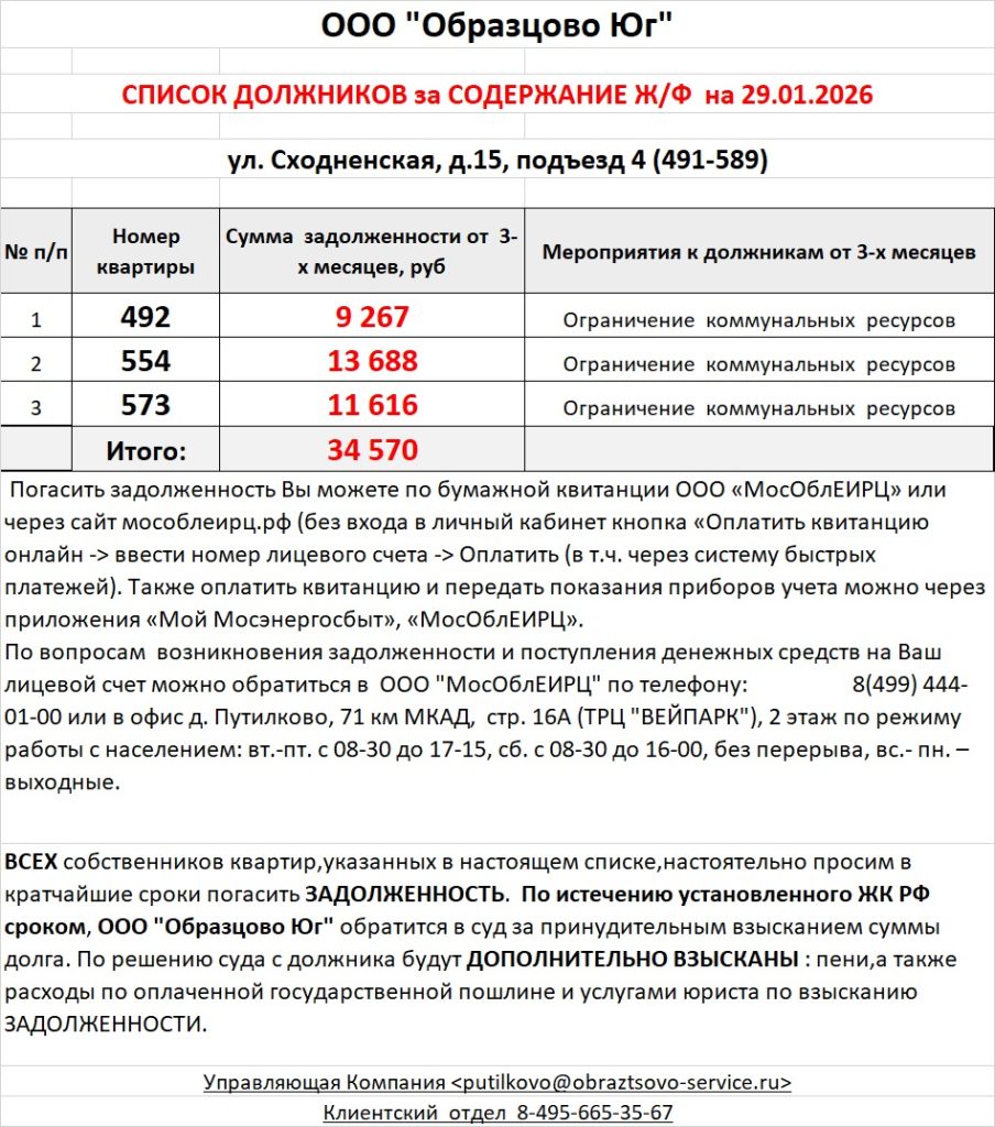 Список должников по коммунальным платежам ул. Сходненская, 29