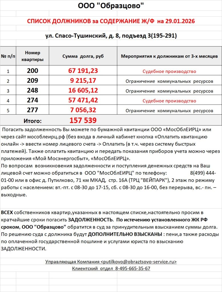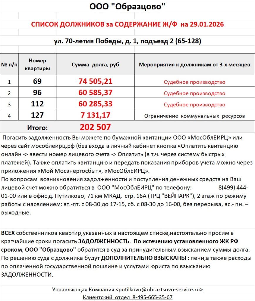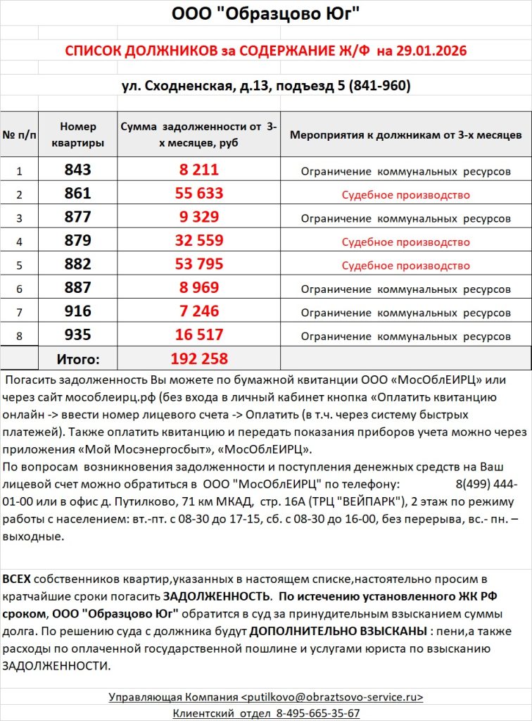 По вопросам возникновения задолженности и поступления денежных средств на Ваш лицевой счет можно обратиться в ООО «МосОблЕИРЦ» по телефону: 8(499) 444-01-00 или в офис д. Путилково, 71 км МКАД, стр. 16А (ТРЦ «ВЕЙПАРК»), 2 этаж по режиму работы с населением: вт.-пт. с 08-30 до 17-15, сб. с 08-30 до 16-00, без перерыва, вс.- пн. – выходные.