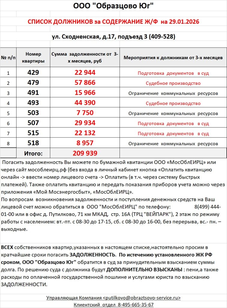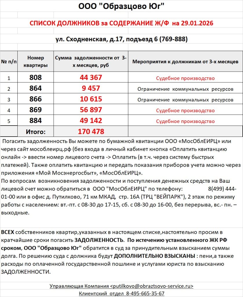 Список должников по коммунальным платежам ул. Сходненская, 17