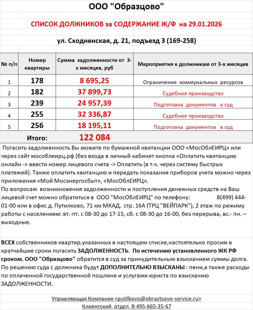 Список должников по коммунальным платежам ул. Сходненская, 21