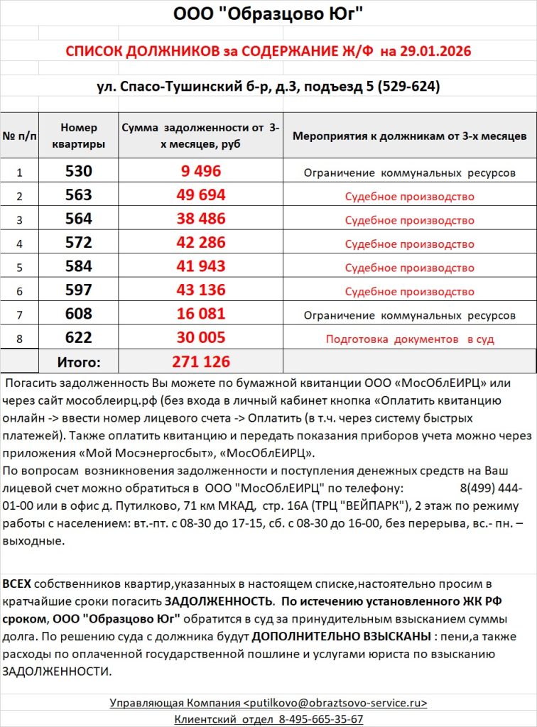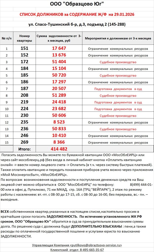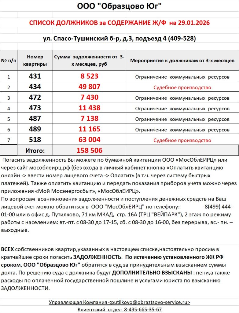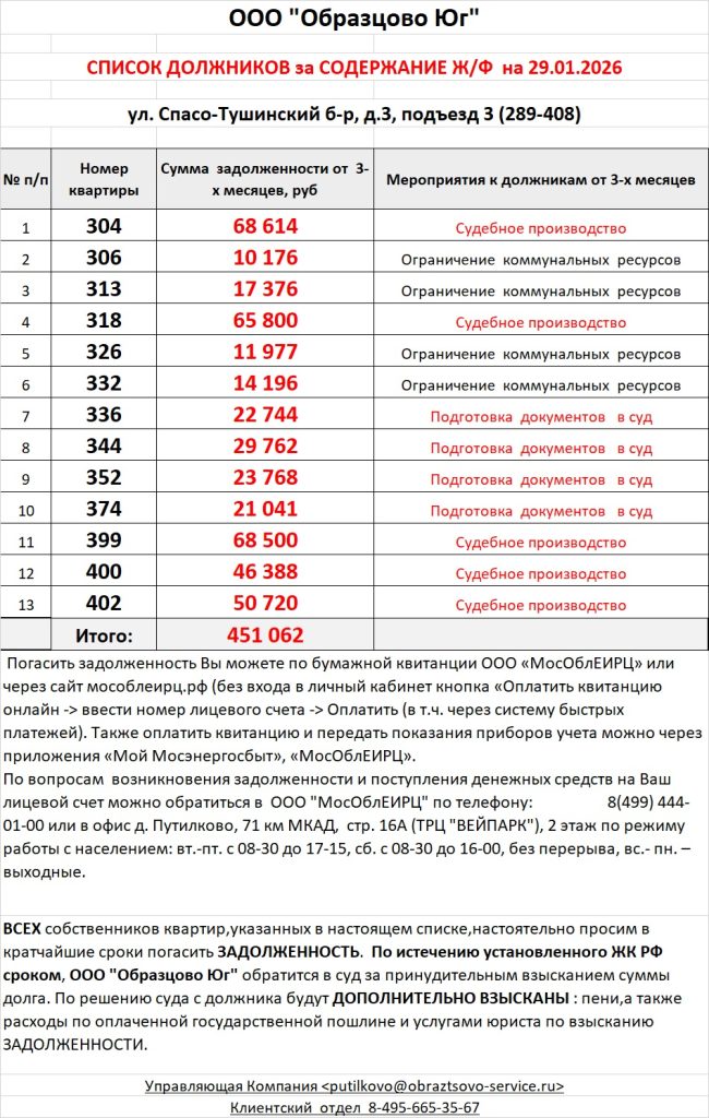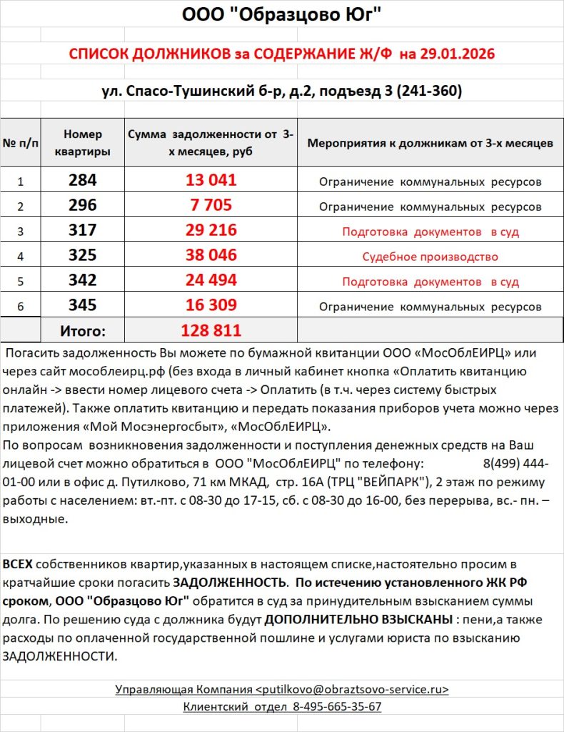 Список должников по коммунальным платежам Спасо-Тушинский бульвар, 3