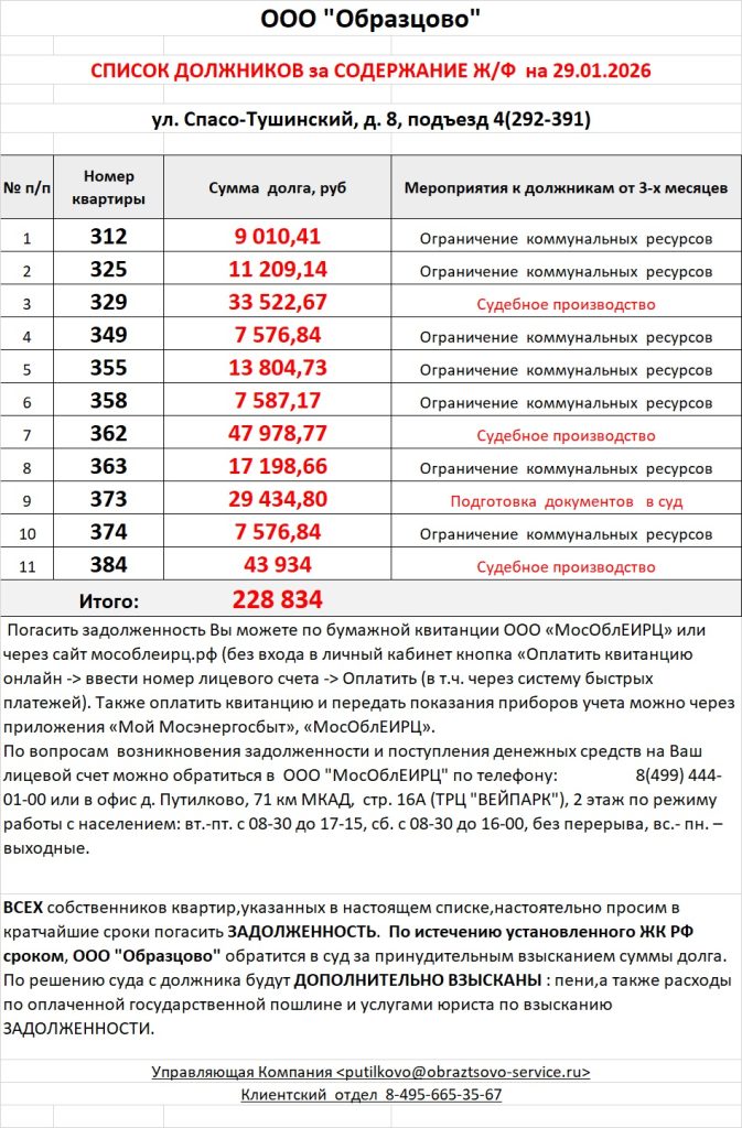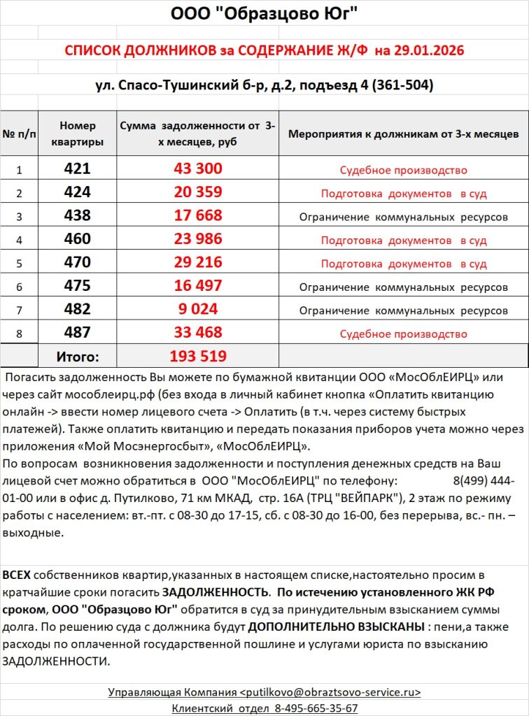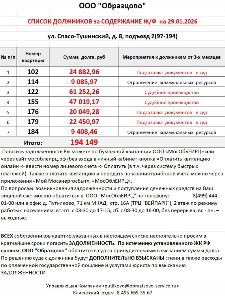 Список должников по коммунальным платежам Спасо-Тушинский бульвар, 2