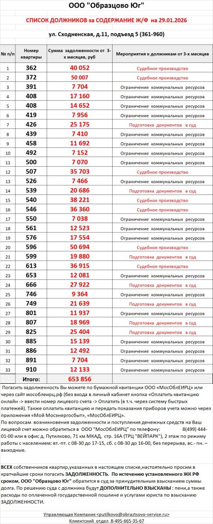 Список должников по коммунальным платежам ул. Сходненская, 11