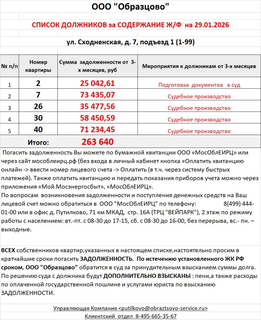 Список должников по коммунальным платежам ул. Сходненская, 7