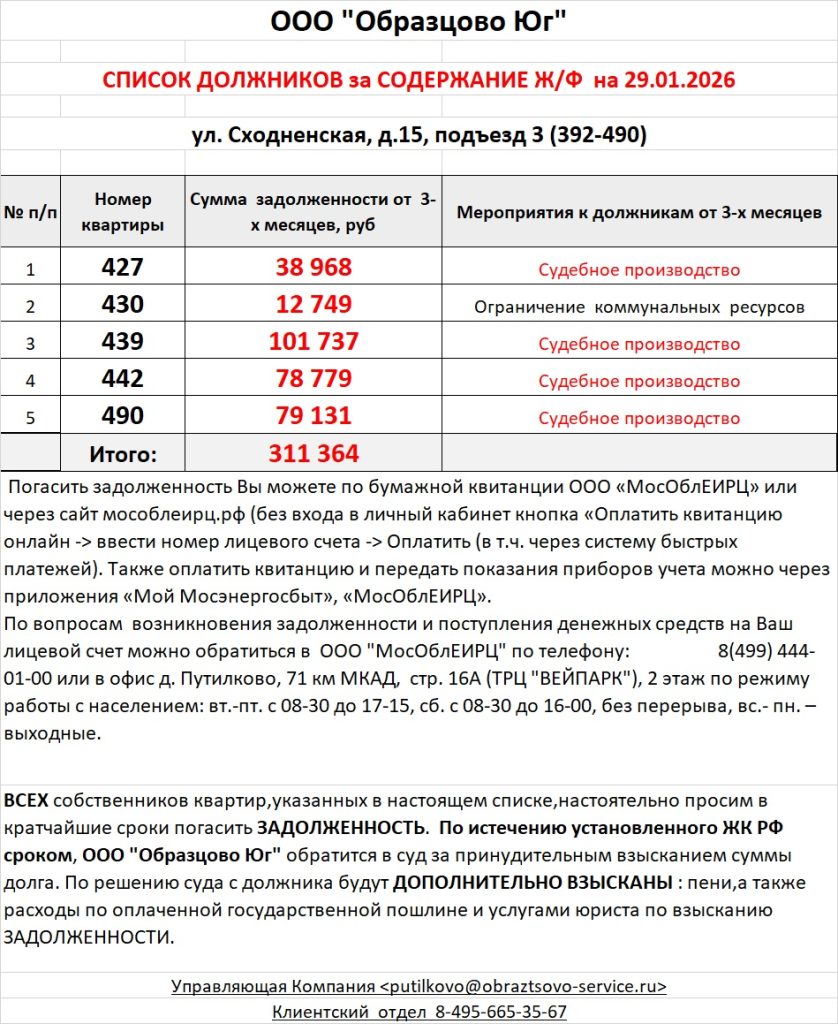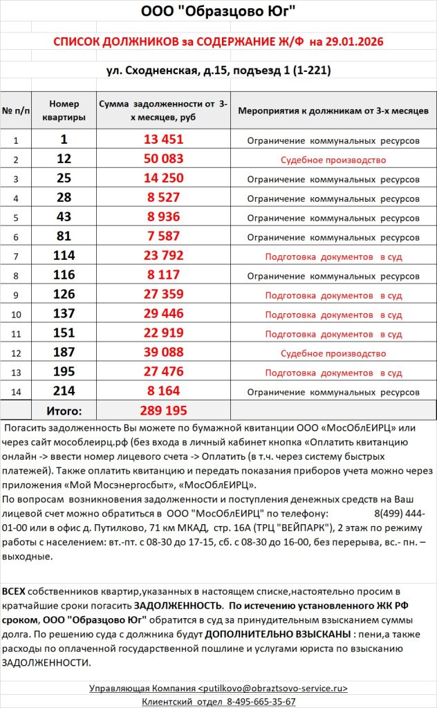 Список должников по коммунальным платежам ул. Сходненская, 15