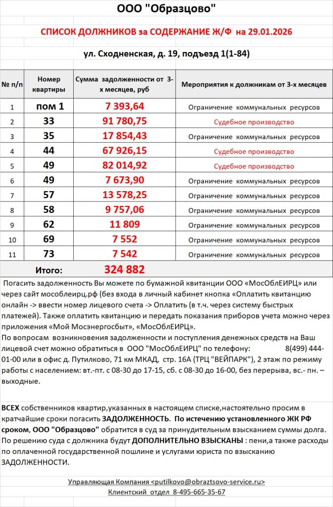Список должников по коммунальным платежам ул. Сходненская, 19