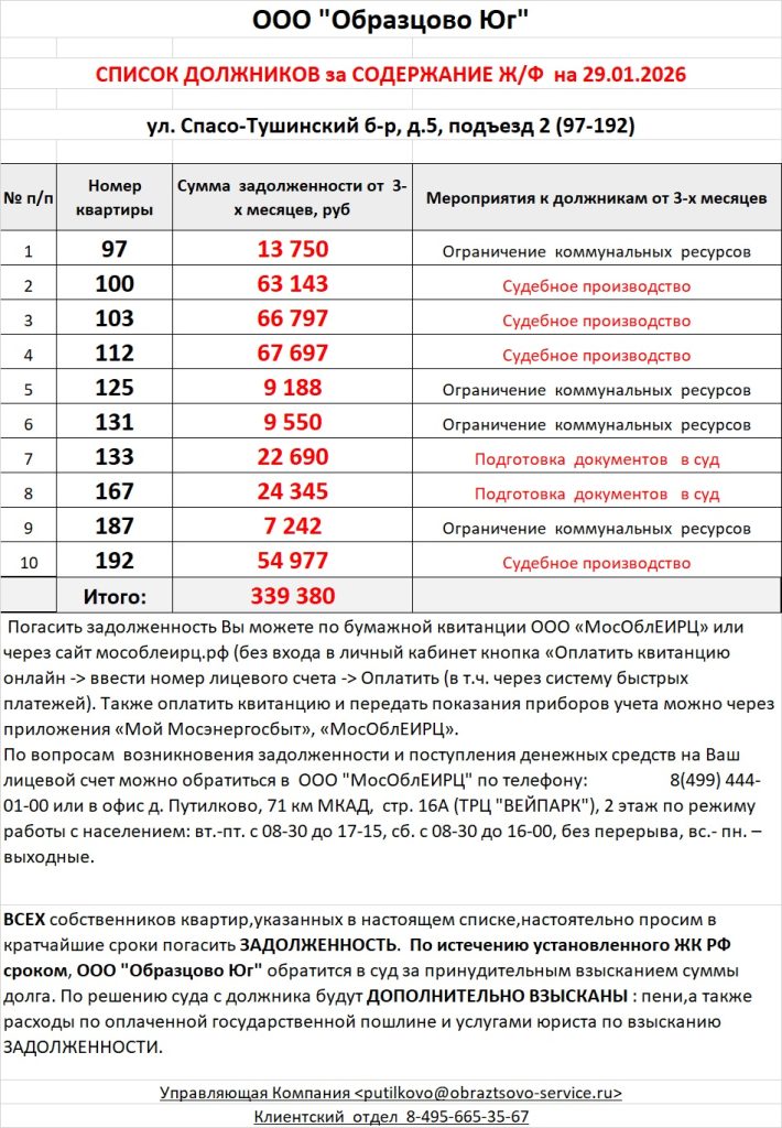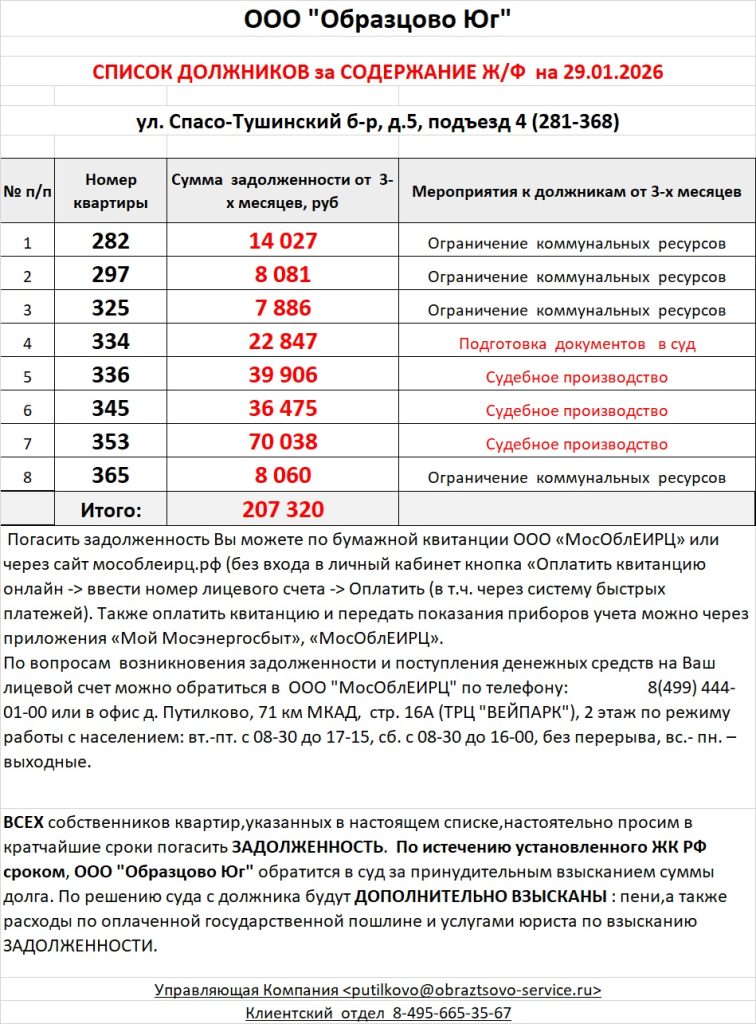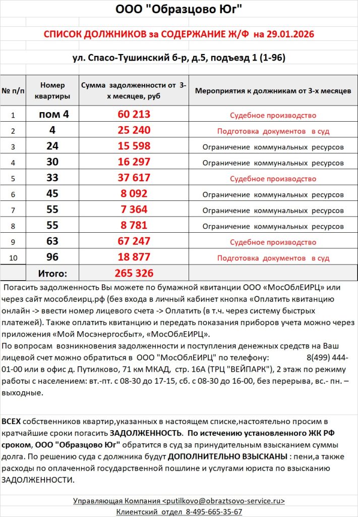 Список должников по коммунальным платежам Спасо-Тушинский бульвар, 5