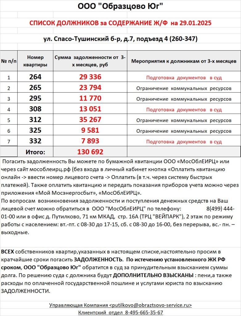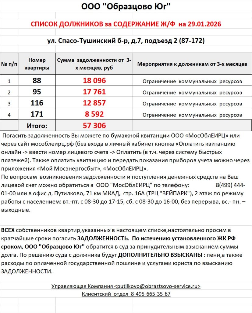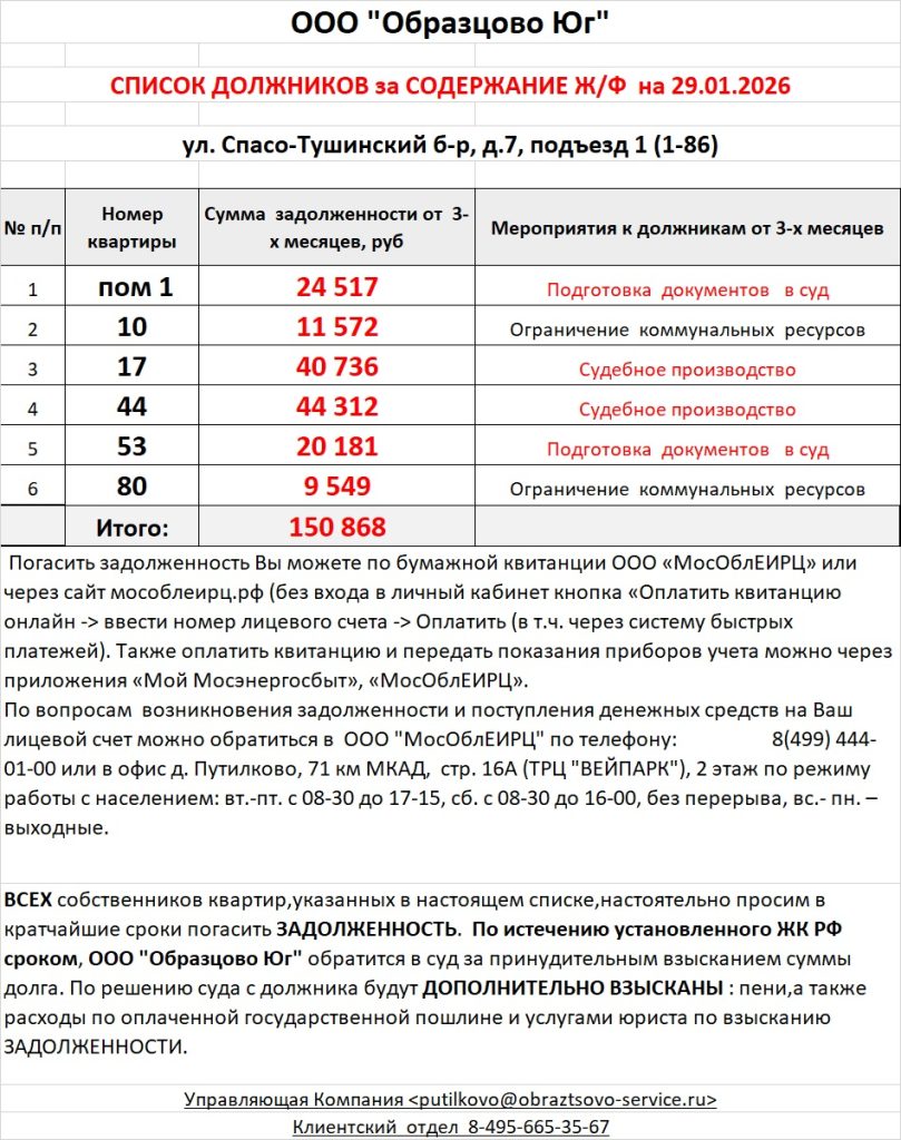 Список должников по коммунальным платежам Спасо-Тушинский бульвар, 7