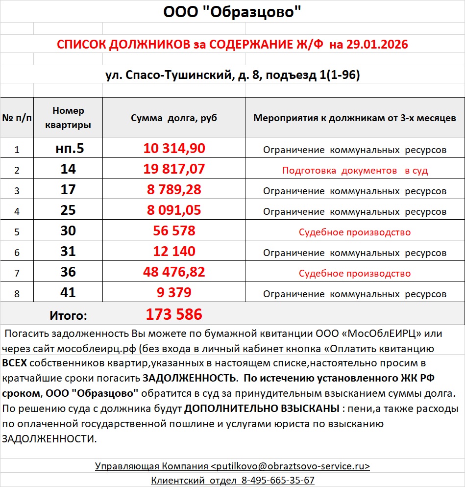 Список должников по коммунальным платежам Спасо-Тушинский бульвар, 8