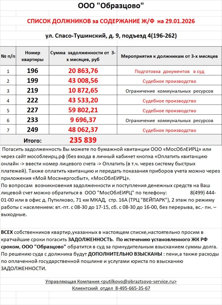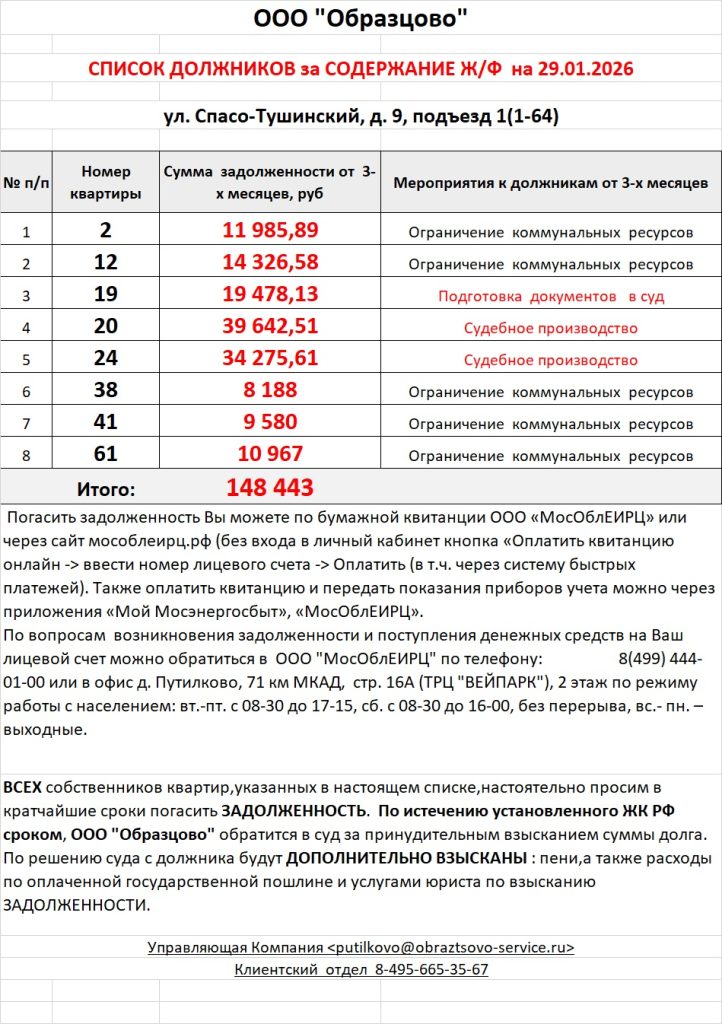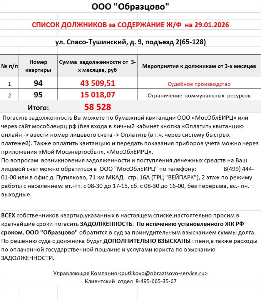 Список должников по коммунальным платежам Спасо-Тушинский бульвар, 9