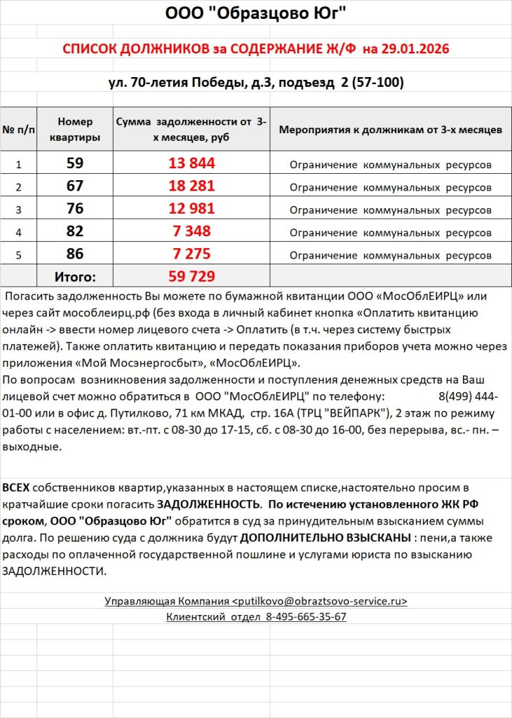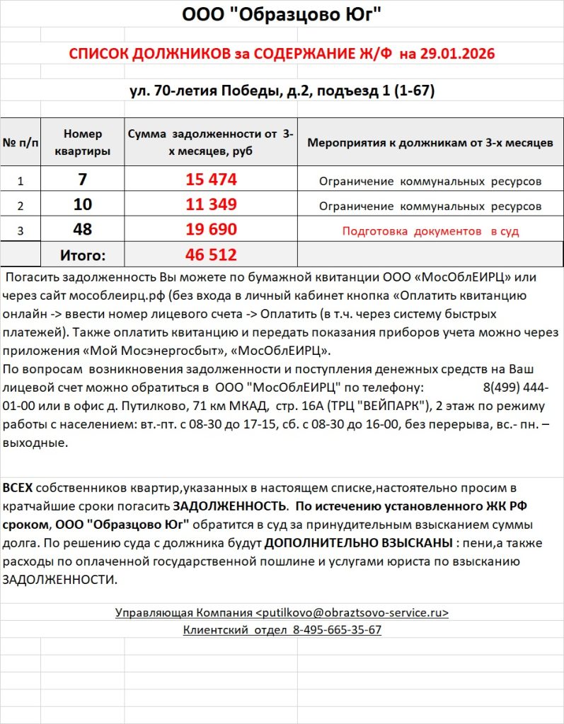 Список должников по коммунальным платежам ул. 70-летия Победы, 3
