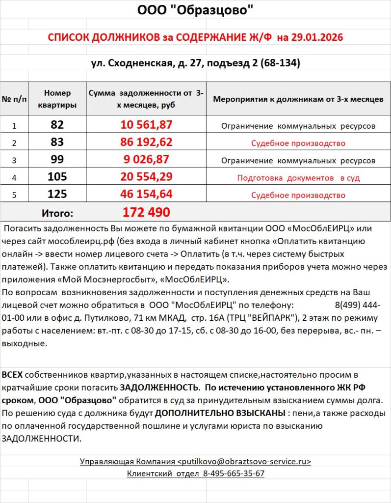 Список должников по коммунальным платежам ул. Сходненская, 27
