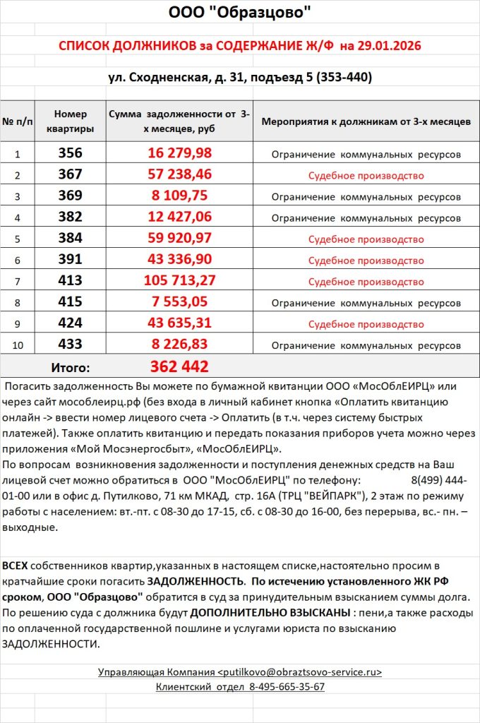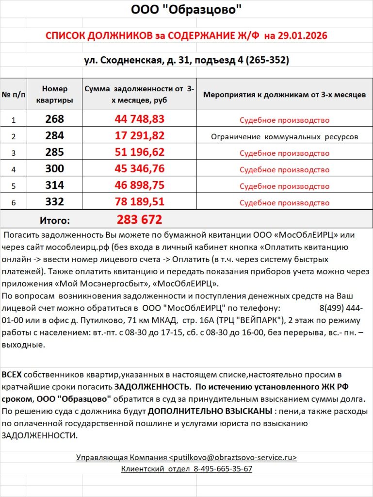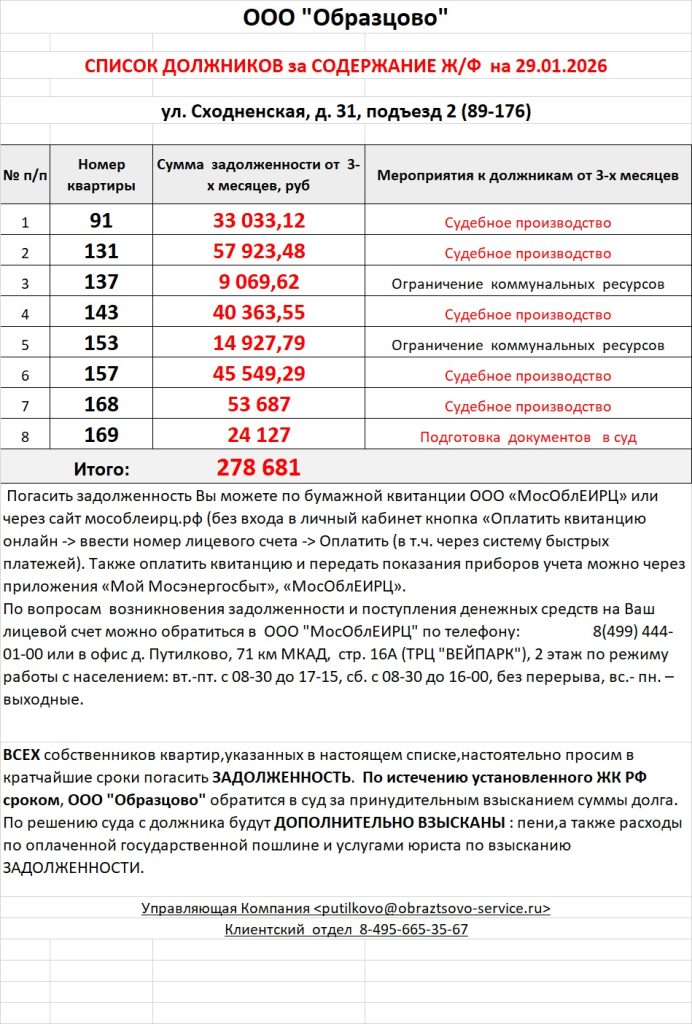 Список должников по коммунальным платежам ул. Сходненская, 31