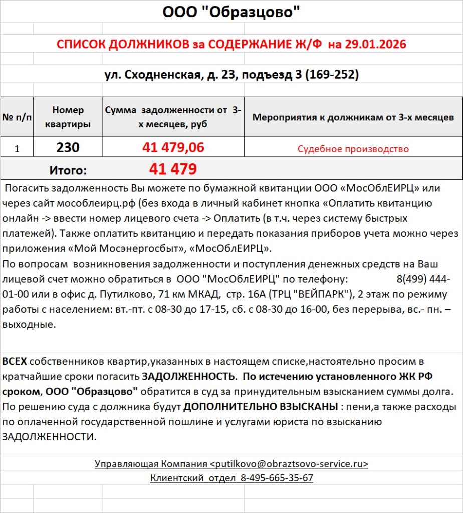 Список должников по коммунальным платежам ул. Сходненская, 23