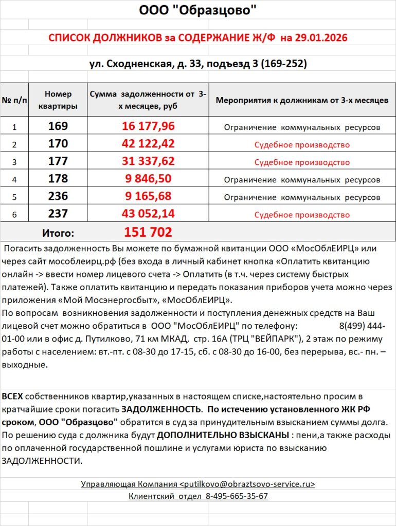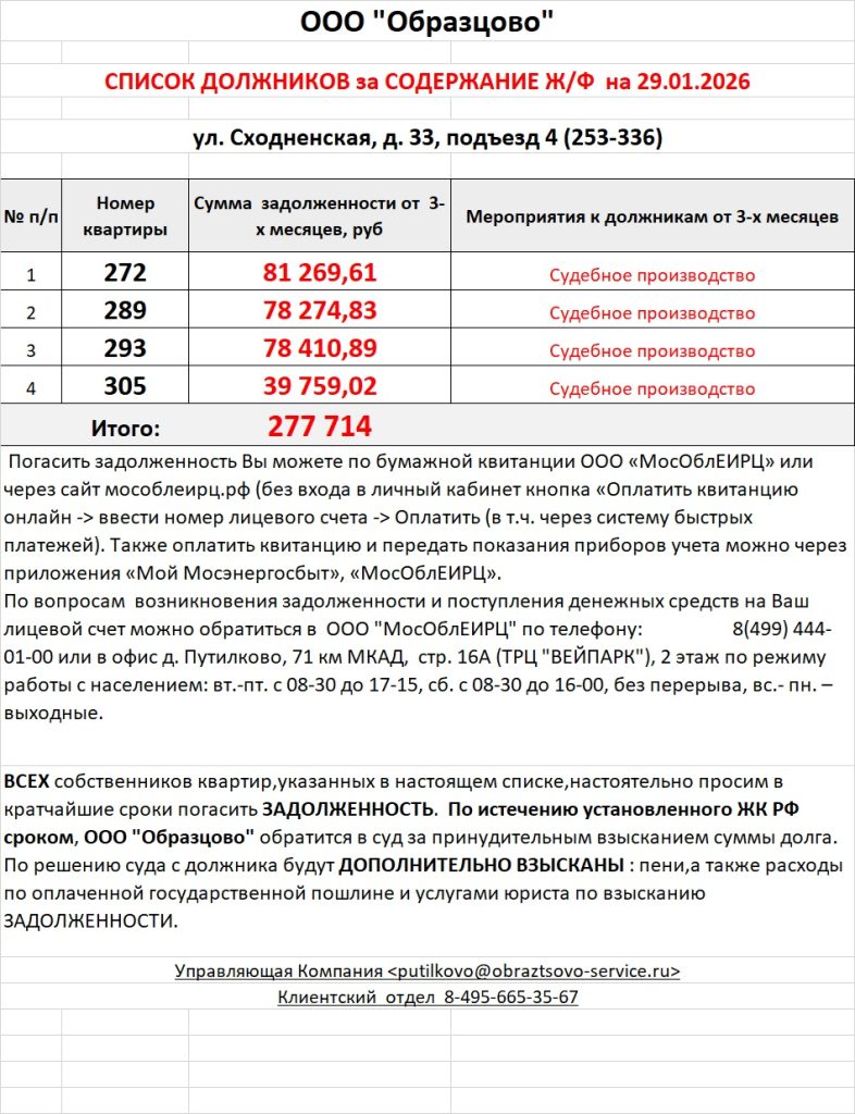 Список должников по коммунальным платежам ул. Сходненская, 33