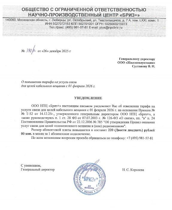 ООО НПЦ «Бриз+», поставщик услуг кабельного телевидения, уведомляет о повышении абонентской платы с 1 февраля 2026 года.