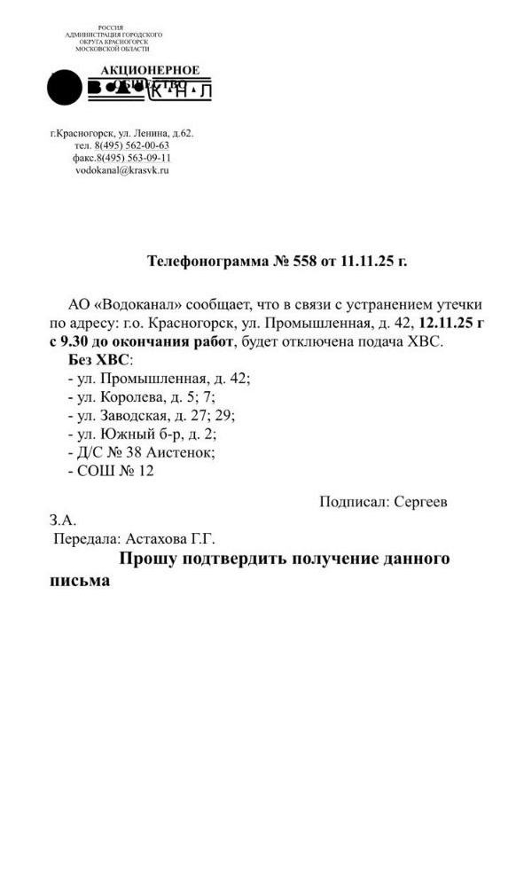 Уважаемые жители микрорайона южный!Внимание! Телефонограмма от АО «Водоканал»
